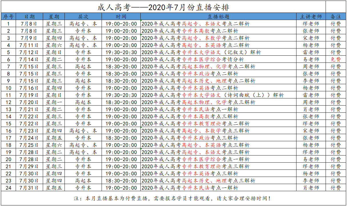 2020年7月云南成人高考直播課程安排(含免費(fèi)課程)