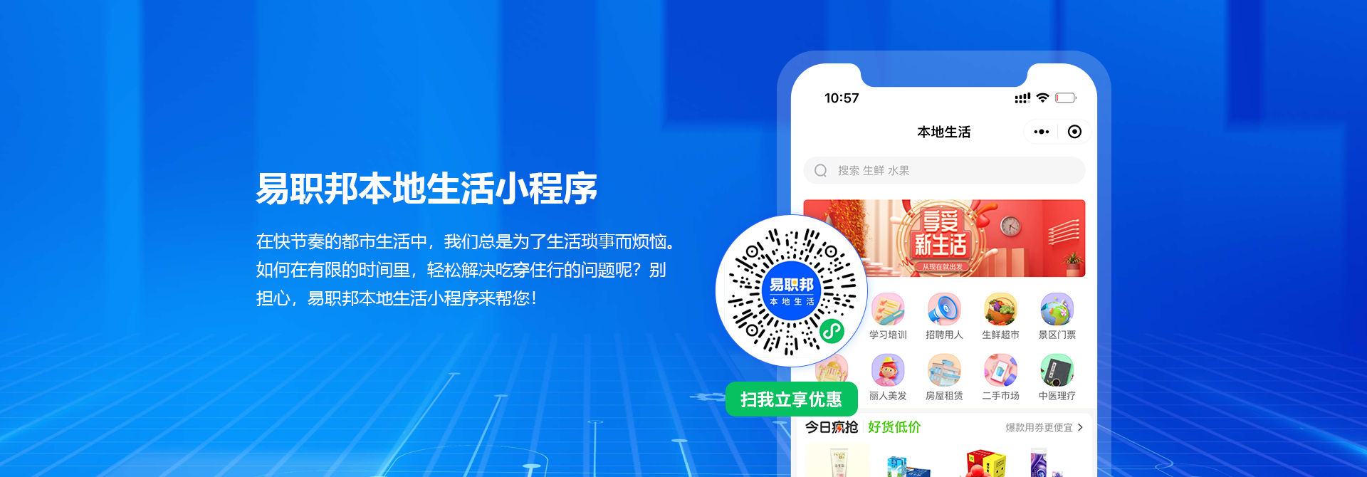 易職邦本地生活小程序幫你在快節奏的都市生活中,解決生活瑣事的煩惱,幫你在有限的時間里,輕松解決吃穿住行問題。