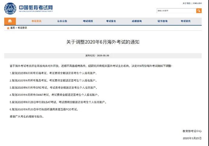鑒于海外考試考點(diǎn)所在高校尚未對外開放,近期不具備組考條件,經(jīng)研究并商相關(guān)國外考試主辦機(jī)構(gòu),決定對6月份海外考試做如下調(diào)整: