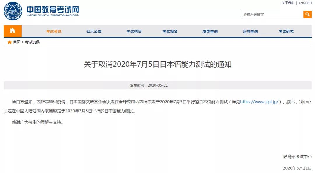 接日方通知,因新冠肺炎疫情,日本國際交流基金會(huì)決定在全球范圍內(nèi)取消原定于2020年7月5日舉行的日本語能力測試(詳見https://www.jlpt.jp/)。據(jù)此,我中心決定在中國大陸范圍內(nèi)取消原定于2020年7月5日舉行的日本語能力測試。